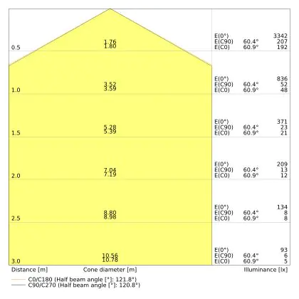 De lichtopbrengst (Lumen), geeft weer hoe krachtig het uitgestraalde licht is. Dit is belangrijk om te weten om de juiste sfeer te creëren. 0 tot 400 Lumen is bij uitstek geschikt voor accent- of sfeerverlichting. Een hoger aantal Lumen is, afhankelijk van de grootte van de ruimte, beter geschikt als ondersteunende- of basisverlichting. Heb je plafonds hoger dan 4 meter, dan is een lichtopbrengst van minimaal 8000lm aan te raden indien heldere verliching gewenst is (vb. in werkomgevingen).