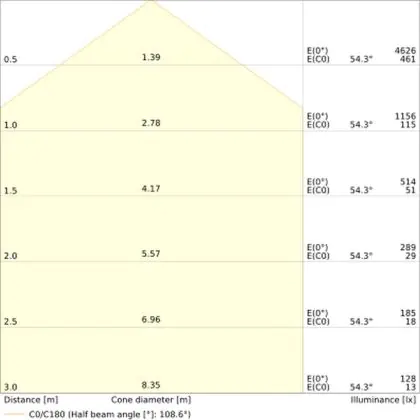 De gradenbundel geeft informatie over hoe breed het licht wordt uitgestraald. Dit zit tussen de 0 en 360 graden (D). Hoe kleiner de hoek, hoe specifieker de lichtbundel is. Over het algemeen is een smalle gradenbundel perfect voor sfeer- of accentverlichting, terwijl een brede gradenbundel ideaal is om grote oppervlaktes te verlichten.