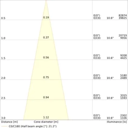 De gradenbundel geeft informatie over hoe breed het licht wordt uitgestraald. Dit zit tussen de 0 en 360 graden (D). Hoe kleiner de hoek, hoe specifieker de lichtbundel is. Over het algemeen is een smalle gradenbundel perfect voor sfeer- of accentverlichting, terwijl een brede gradenbundel ideaal is om grote oppervlaktes te verlichten.
